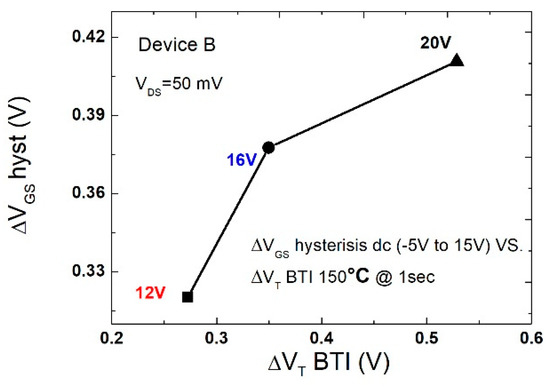 Figure 12 shows the mean values of the hysteresis amplitude evaluated at a fixed current level (ID = 5 mA) against the mean values of ∆Vth (which were measured with the OSDD method) induced by a PBTI stress (temperature at 150 °C and stress time = 1 s). The two phenomena exhibit similar temperature dependence and are strongly correlated, suggesting that the same physical mechanism is the main factor responsible for hysteresis and PBTI. A clear correlation between hysteresis and PBTI was observed.