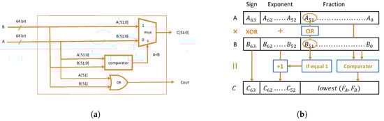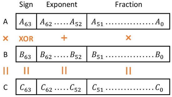 Given two such numbers, A and B, the multiplication can be accomplished through a three-step operation. Based on Figure 2, the sign bit of the result, , is calculated by XORing and . Adding the exponent portions of the inputs leads to the exponential value of the result. And the 52-bit fractional value or mantissa is equal to the product of input fractions.