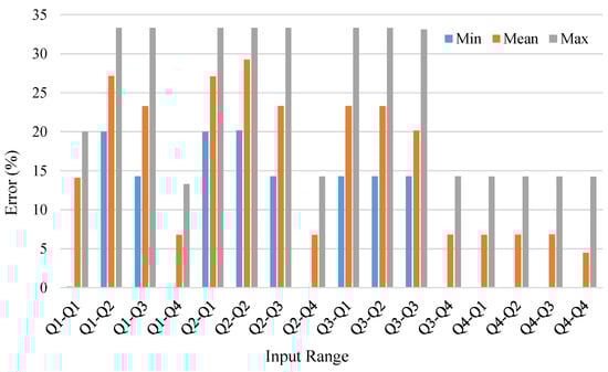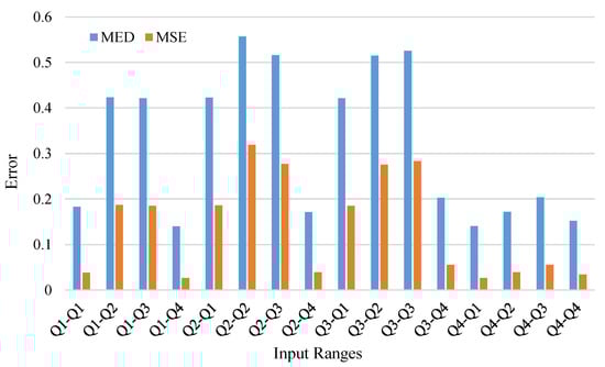 In Figure 4, we divide each of the input mantissae into four quarters (denoted with to ), based on their proximity to 1. Each quarter refers to a specific range for the input mantissae; (1) for the mantissa is in the range , (2) for the mantissa is in the range , (3) for the mantissa is in the range , and (4) for the mantissa is in the range . Each pair of input ranges are identified using the notation , where . For example, refers to a case where the first input is in the range , and the second input is in the range . This leads to 4×4 combinations of input ranges. Figure 4 demonstrates the error of the proposed CEM over each of these 16 input ranges, in terms of MED and MSE metrics. Figure 5 shows the error percentage of the CEM. These metrics are evaluated over 10000 randomly generated numbers—in Figure 4 and Figure 5 all three metrics follow almost the same trend; thus, we only investigate the errors through the MED metric. As shown in Figure 4, for six input ranges, at least one input is close to 2 (i.e., there is at least one , e.g., and ), thus they have relatively smaller MED. Within these six input ranges, as the difference between the two inputs enlarges (or one input gets closer to 1), the error gets smaller. This is why and have the lowest errors. For , both input ranges are close to 1; therefore, it has a relatively small MED. The same error pattern can be seen for other input ranges as well, i.e., as the absolute difference between two numbers enlarges, the error gets reduced. Also, as one input gets closer to 2 or 1, the error decreases.