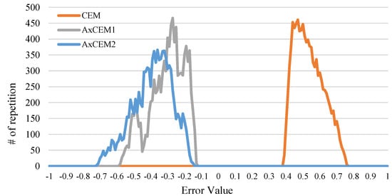 The error histogram of the CEM, AxCEM1, and AxCEM2.