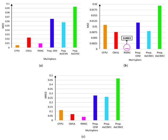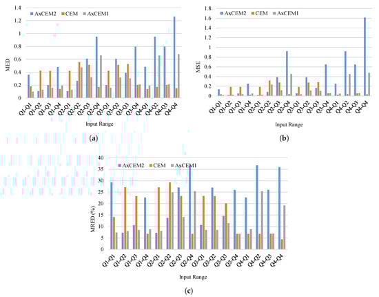 Error comparison between CEM, AxCEM1, and AxCEM2; (a) MED, (b) MSE, and (c) MRED.