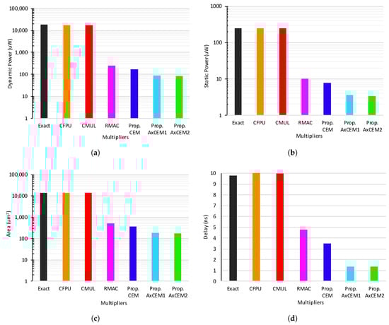 In Figure 9, we compare the circuit metrics (i.e., dynamic and static power consumption, occupied area, and delay) of the proposed designs with those of the exact multiplier and previous approximate ones. Figure 9a,b indicate that regarding the dynamic and static power, all three proposed designs, the CEM, AxCEM1, and AxCEM2 perform the best, followed by RMAC—RMAC also replaces the mantissae product computation unit with a much simpler circuit, i.e., adder. Figure 9a shows that the proposed AxCEMs achieve more than two orders of magnitude improvements concerning the dynamic power consumption, compared with the exact, CFPU, and CMUL multipliers. When compared with RMAC, proposed CEM, AxCEM1, and AxCEM2 exhibit 30, 65, and 66% improvements, respectively. Likewise, the proposed designs consume less static power by more than one order of magnitude in comparison with the exact, CFPU, and CMUL, and up to 66% when compared with RMAC.