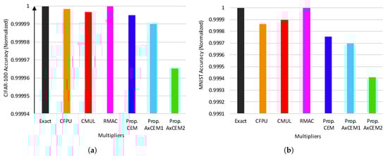 Figure 11 depicts the quality of results of a CNN over two datasets, i.e., CIFAR-100 and MNIST. The vertical axis shows the probability of success for correctly classifying and identifying the input images, and they are normalized based on the exact-CNN. In Figure 11a, it can be seen that the accuracy of CEM-CNN matches to that of exact-CNN up to the fifth decimal place. AxCEM1 and AxCEM2-CNN show small degradations in the accuracy compared to exact, CFPU, CMUL, and RMAC. For the MNIST dataset, the proposed designs-based CNN accuracy loss reaches up to 0.06%—the probability of success for exact-CNN and AxCEM2 is 96.6921% and 96.6348%, respectively.