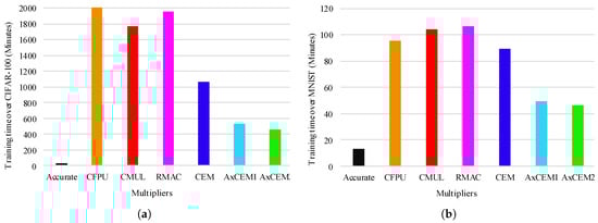 As shown in Figure 12, for the training step, in general, the training time for CNNs employing the approximate multipliers is higher than the accurate-CNN. However, the CNNs employing the proposed designs (i.e., CEM, AxCEM1, and AxCEM2) takes a shorter time to be trained in comparison with the CNNs based on the prior approximate multipliers (i.e., CFPU, CMUL, and RMAC). For CIFAR-100 dataset, Figure 12a shows that the CNNs based on the proposed designs are trained at least 25% faster than the prior wok-based CNNs. Based on Figure 12a, the training times for CFPU-CNN, CMUL-CNN, and RMAC-CNN are more than 1600 minutes, while the proposed CEM-CNN, AxCEM1-CNN, and AxCEM2-CNN, are trained in less than 1200 minutes. For MNIST, the CNNs employing the proposed designs show better performance in comparison with the prior approximate multipliers based CNNs. Figure 12b shows that the CMUL and RMAC-CNNs take more than 100 minutes to train. And the training time for CFPU-CNN is 95 minutes. For the CEM, AxCEM1, and AxCEM2-CNNs the training times are 89, 49 and 45 minutes, respectively. In summary, the results insinuate that although the proposed designs, when considered as standalone designs, perform poorly w.r.t. MED, MSE, and MRED, they are quite good candidates for approximating CNNs as a whole, due to there negligible accuracy loss when employed so.