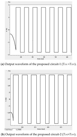 For the second proposed circuit in Figure 6, the values of resistors R11 = R12, equivalent resistance R2 and capacitor C, are derived from the above process as stated in fixed duty cycles. Then the resistors R11 and R12 are tuned independently in order to set the required on-duty and off-duty cycles. If resistor R11 is chosen to be greater than the resistor R12, then the on-duty cycle is more than the off-duty cycle. These values will be (R12 > R11) reversed to set the off-duty cycle more than the on-duty cycle. The passive components R2 =1.5 kΩ (W = 5μm, L = 180 nm, VX = 80 mV), R11 = 1.5 kΩ, R12 = 5 kΩ, and C = 0.1µF were used to design the second proposed circuit in Figure 6. Figure 9b,c provide the corresponding simulated output waveforms for the second proposed circuit. From Figure 9b,c, the simulated time period is 0.36 ms, which is close to the theoretical time period of 0.32 ms.