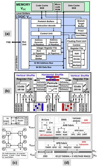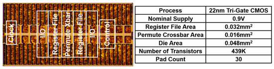 - Hsu, S.; Agarwal, A.; Anders, M.; Mathew, S.; Kaul, H.; Sheikh, F.; Krishnamurthy, R. A 280mV-to-1.1V 256b reconfigurable SIMD vector permutation engine with 2-dimensional shuffle in 22nm CMOS. In Proceedings of the 2012 IEEE International Solid-State Circuits Conference, Institute of Electrical and Electronics Engineers, San Francisco, CA, USA, 19–23 February 2012; pp. 178–180. [Google Scholar]