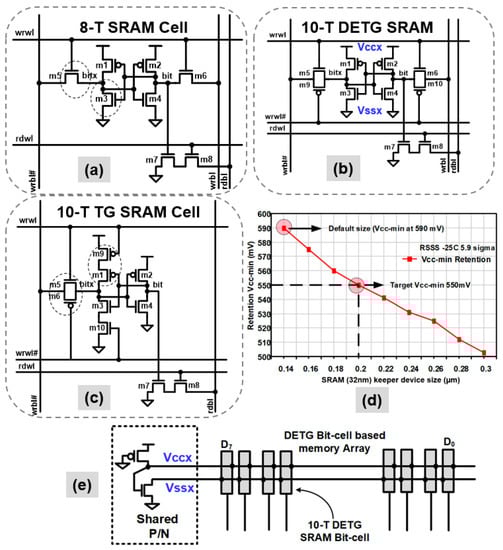 The prototypes use variability-tolerant SRAM bit-cells: (a) 8-T SRAM bit-cell used in the NTV-MCU; (b) The SIMD engine uses a 10-T dual-ended transmission gate (DETG) SRAM topology; (c) An alternate 10-T transmission gate (TG) SRAM bit-cell used in the NTV-CPU; (d) Simulated retention voltage simulations for the 10-T TG SRAM in 32-nm, as a function of keeper device size (m9, m10) in the presence of random variations (5.9σ, slow skew, −25 °C); (e) The shared PMOS/NMOS on the virtual supplies improve memory write Vmin by 125 mV in the 22-nm DETG based memory array.