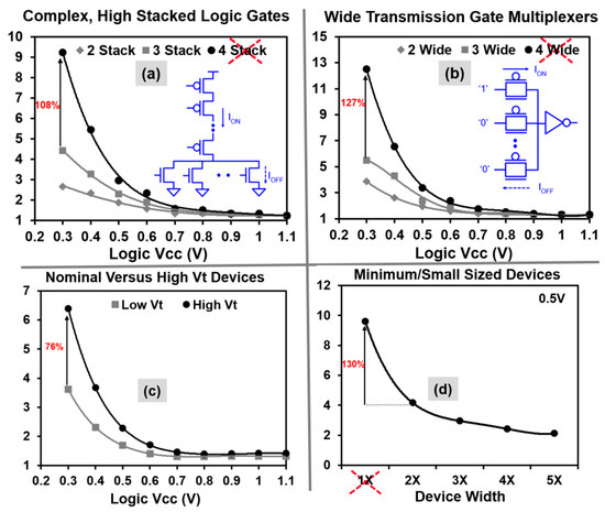 Circuits are optimized for robust and reliable ultra-low voltage operation. A variation-aware pruning is performed on the standard cell library to eliminate the circuits which exhibit DC failures or extreme delay degradation at NTV due to reduced transistor on/off current ratios and increased sensitivity to process variations. Simulated 32-nm normalized gate delays (y-axis), as a function of VDD for logic devices in the presence of random variations (6σ) is presented in Figure 3. Complex logic gates with four or more stacked devices and wide transmission-gate multiplexers with four or more inputs are pruned from the library because they exhibit more than 108% and 127% delay degradation compared to three stack or three-wide multiplexers respectively (Figure 3a,b). Critical timing paths are designed using low VT devices because high VT devices indicate 76% higher delay penalty at 300 mV supply, in the presence of variation (Figure 3c). All minimum-sized gates with transistor widths less than 2× of the process-allowed minimum (ZMIN) are filtered from the library due to 130% higher variation impact (Figure 3d), and the use of single fin-width devices is limited in 22-nm and 14-nm logic design.