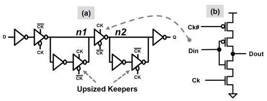 Low-voltage pass-gate free sequential circuit: (a) clocked-CMOS-style flip-flop implementation; (b) Clocked inverter logic gate.