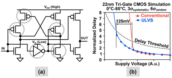 Ultra-low voltage split-output (ULVS) level shifter: (a) Circuit diagram with critical devices circled; (b) Simulated 22-nm Vmin benefit of 125mV node in the presence of random variations (6σ).