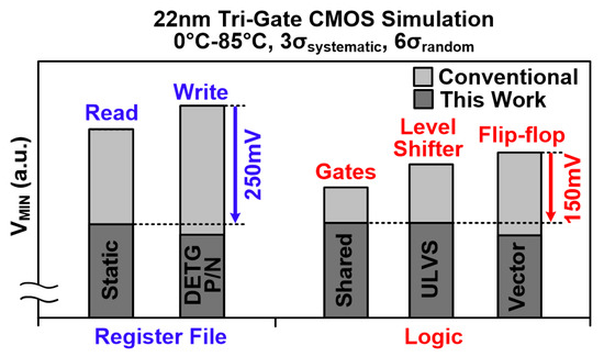 Figure 7 summarizes improvements achieved from applying multiple circuit techniques for both the register file and logic circuits across 0–85 °C in the 22-nm SIMD engine. The static register file read circuits and shared P/N DETG write SRAM bit-cells improve overall register file Vmin by 250 mV. Shared gates, ULVS level shifters, and vector flip-flops improve overall logic Vmin by 150 mV.