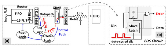 NTV-NoC: (a) Two-stage router data path and control logic indicating critical timing path; (b) Pipe stage 2 is enhanced with EDS circuit to detect failures in critical timing paths down to NTV.