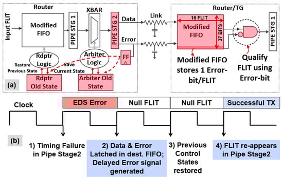 Internal router architecture: (a) Modifications to enable FLIT replay and forward error correction; (b) Clock cycle diagram showing stages of timing failure detection, replay and recovery.