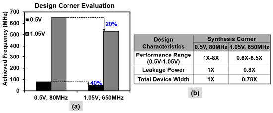 Achieving the performance targets across the entire voltage range is challenging since critical path characteristics change considerably due to non-linear scaling of device delay and a disproportionate scaling of device versus interconnect (wire) delay. It is critical to identify an optimal design point such that the targeted power and performance are achieved at a given corner without a significant compromise at the other corner. Synthesis corner evaluations for the NTV-CPU (Figure 10a) suggest that 0.5 V, 80 MHz synthesis achieves the target frequency at both 0.5 V (80 MHz) and 1.05 V (650 MHz). In comparison, it is observed that 1.05 V synthesis does not sufficiently size up the device dominated data paths which become critical at lower voltages, resulting in 40% lower performance at 0.5 V. Although 1.05 V synthesis achieves lower leakage and better design area, the 0.5 V corner was selected for final design synthesis of the NTV prototypes, considering its low voltage performance benefits and promise for wide operational range. Performance, area and power metrics at the two extreme design corners in a 32-nm node are presented in Figure 10b. For subsequent NTV prototypes, a multi-corner design performance verification (PV) methodology that simultaneously co-optimizes timing slack across all the three performance corners was developed. This PV approach ensures that performance targets are met across the wide voltage operational range. The method accounts for non-linear scaling of device delays in the critical path versus interconnect delay scaling across wide VDD. At low voltages, severe effects of process variations result in path delay uncertainties and may cause setup (max) or hold (min) violations. Setup violations can be corrected by frequency binning. However, hold violations can cause critical functional failures. The design timing convergence methodology is enhanced to consider the effect of random variations and provide enough variation-aware hold margin guard-bands for robust NTV operation.