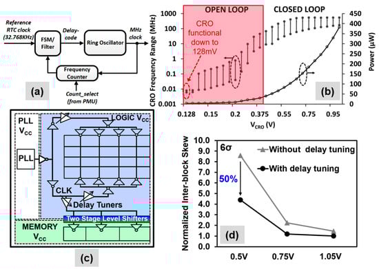 Multi-voltage global clock generation and distribution: (a) Calibrated Ring Oscillator (CRO) used in 14-nm NTV-MCU; (b) CRO operating range in both open/closed loops with µW power consumption; (c) The global clock distribution in the 32-nm NTV-CPU uses multi-stage level shifters; (d) Simulated clock skew reduction benefit from voltage specific delay tuning using look-up tables.