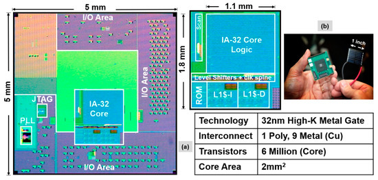 - Jan, C.-H.; Agostinelli, M.; Buehler, M.; Chen, Z.-P.; Choi, S.-J.; Curello, G.; Deshpande, H.; Gannavaram, S.; Hafez, W.; Jalan, U.; et al. A 32nm SoC platform technology with 2nd generation high-k/metal gate transistors optimized for ultra low power, high performance, and high density product applications. IEEE Int. Electron Devices Meet. 2009, 1–4. [Google Scholar] [CrossRef]