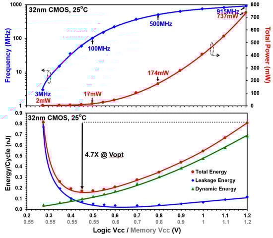 - Hanson, S.; Zhai, B.; Bernstein, K.; Blaauw, D.; Bryant, A.; Chang, L.; Das, K.K.; Haensch, W.; Nowak, E.J.; Sylvester, D.M. Ultra low-voltage, minimum energy CMOS. IBM J. Res. Dev. 2006, 50, 469–490. [Google Scholar] [CrossRef]