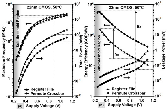 Frequency and power measurements for the SIMD engine components are presented in Figure 16, obtained by sweeping the supply voltage from 280 mV to 1.1 V in a temperature-stabilized environment of 50 °C. Chip measurements show that the register file and crossbar operate from 3 GHz (1.1 V) down to 10 MHz (280 mV). The register file dissipates 227 mW (1.1 V) and 108 µW (280 mV) respectively, while the permute crossbar consumes 69 mW–19 µW over the same VDD range. The maximum energy efficiency of 154 GOPS/W (1 OP = three 256b reads and one 256b write) is obtained at a supply voltage of 280 mV (VOPT) and is 9× higher than the efficiency at nominal voltage. The 256b byte-wise any-to-any permute crossbar executes horizontal shuffle operations down to supply voltages of 240 mV. Peak energy efficiency of 585 GOPS/W (1 OP = one 32-way 256b permutation) is achieved at a supply voltage of 260 mV, also with 9× better energy efficiency.