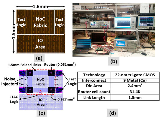 The 2 × 2 2-D mesh-based resilient NoC prototype is fabricated in a 22 nm, 9-metal layer technology. Each router port features bidirectional, 36-bit wide, 1.5 mm long on-die links. The die area is 2.4 mm2 with a NoC area of 0.927 mm2 and a router area being 0.051 mm2, as highlighted in the NoC die and NoC layout photographs (Figure 17a,c). There are approximately 31,400 cells in each router. The experimental setup and key design characteristics are shown in Figure 17b,d.
