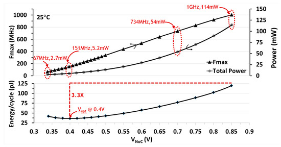 Silicon measurements are performed at 25 °C for a representative NoC traffic pattern with FLIT injection at each router port every clock cycle at 10% data activity. The 2 × 2 NoC is functional over a wide operating range (Figure 18) with maximum frequency (FMAX) of 1 GHz (0.85 V), 734 MHz (0.7 V), 151 MHz (400 mV), scaling down to 67 MHz (340 mV). A 3.3X improvement in energy-efficiency is achieved at a VOPT of 400mV with an aggregate router bandwidth (BW) of 3.6 GB/s.