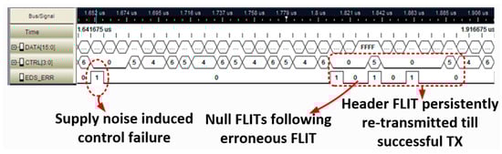 The measured NoC silicon logic analyzer trace (Figure 19) shows a supply noise-induced timing failure on the control bits of the packet header FLIT, followed by two cycles of bubble (null) FLITS and persistent retransmission (replay) of the FLIT until successful recovery. As shown, timing error synchronization and roll-back incurs a 2-cycle delay between an error event and successful recovery.