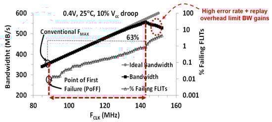Figure 20 plots the measured BW for the resilient router at 400 mV, in the presence of a 10% VNoC droop induced by the on-die noise injectors. The number of erroneous FLIT increases exponentially with FCLK. To account for such droop, a non-resilient router must operate with 28% (700 mV) and 63% (400 mV) FCLK margins, respectively, thus limiting FMAX. The resilient router reclaims these margins and offers near-ideal BW improvement until higher error rates and FLIT replay overheads limit overall BW gains. Past the point-of-first failure (PoFF), both control and data bits are corrupted. While ECC can identify data bit failures, control bit failures can invalidate the entire FLIT, rendering any ECC scheme ineffective. If control paths are designed with enough timing margins such that the control bits do not fail, the FCLK gain from SECDED ECC is only 7% beyond PoFF, since several data bits fail simultaneously. In contrast, at 400 mV, the EDS scheme provides tolerance to multi-bit failures over a 9X wider FCLK range, past PoFF. Compared to a conventional router implementation, the resilient router offers 28% higher bandwidth for 5.7% energy overhead at 700 mV and 63% higher bandwidth with 14.6% energy improvement at 400 mV.