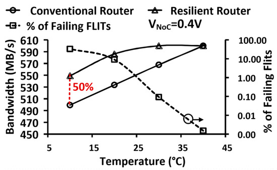 As the supply voltage approaches VT, elevated (lowered) silicon temperature results in increased (decreased) device currents. This phenomenon is generally known as Inverse Temperature Dependence (ITD) [25]. With process scaling and the introduction of high-κ/metal-gate, devices exhibit higher (negative) temperature coefficient along with weaker mobility temperature sensitivity [26]. This inverses the impact of temperature rise on delay, particularly as VDD is lowered, where a small change in VT results in a large current change—requiring large timing margins for NTV designs. As device and VDD scaling exacerbates ITD, the need for characterizing and understanding ITD, and incorporating adaptive architectures becomes even more imperative. Measurements on the 22-nm NoC prototype indicate that ITD effects are observed at NTV, with router timing failures increasing as the die temperature decreases. Data in Figure 21 shows at 400 mV operation, a 30 °C temperature decrease (from 40 °C → 10 °C) causes the percentage of failing FLITs to rapidly increase. However, the resilient router recovers from transient timing failures due to EDS circuit error detection and the FLIT replay mechanism. This improves BW and FCLK margins by 50% at 10 °C, when compared to a non-resilient router design.