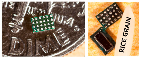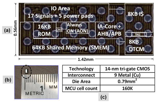 The MCU is fabricated using 14-nm tri-gate CMOS technology with nine metal interconnect layers (Figure 22). The MCU cell count is approximately 160 K and the die area is 0.79 mm2 (0.56 mm × 1.42 mm). The surface-mount ball grid array (BGA) package has 24 pins with an area of 4.08 mm2 (2.46 mm × 1.66 mm). The die photograph with key IP blocks identified and design characteristics are highlighted in Figure 23. The diminutive low-power MCU can serve as a key component for future autonomous, self-powered “smart dust” WSNs [27]—which can sense, compute, and wirelessly relay real-time information about the ambient.