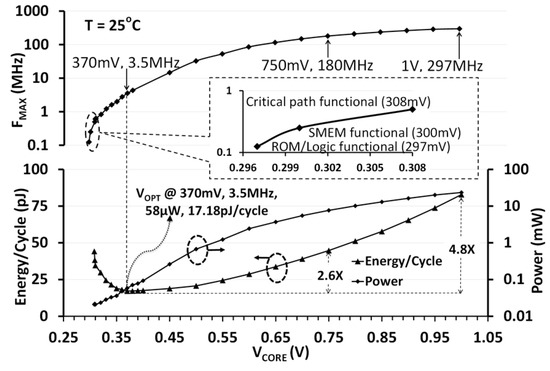 The IA MCU is functional over a wide operating range (Figure 24) from 297 MHz (1 V) scaling down to 0.5 MHz (308 mV) at 25 °C. While the entire MCU is functional down to 308 mV, SMEM functionality was validated down to 300 mV by independently writing and reading to it via the TAP debug interface. The ROM and the AHB logic are found to be functional down to 297 mV. With the MCU continuously executing a data encryption workload (AES-128), the minimum energy point is observed at 370 mV (VOPT) at T = 25 °C. At VOPT, the MCU operates at 3.5 MHz and dissipates 58 µW power, which translates to an energy-efficiency metric of 17.18 pJ/cycle. Compared to super-threshold operation at 1 V, NTV operation at VOPT achieves 4.8× improvement in energy efficiency.