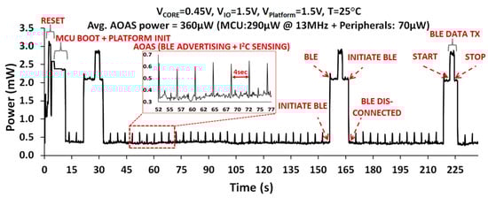 The WSN incorporating the NTV CPU operates continuously using the energy harvested by a 1 cm2 solar cell from indoor light (1000 lux), with sensor data transmitted over BLE radio. The measured WSN power profile in AOAS mode over a 4-min interval is shown in Figure 25. In the AOAS operating mode (with BLE advertising + sensor polling every four seconds), average power (PAVG) for the entire WSN is 360 µW, with the MCU contributing 290 µW (13 MHz, 0.45 V). The MCU power further drops to 120 µW in deep sleep state. In the deep sleep state, the core (IA + AHB) and CRO domains are power gated. The AON logic is still powered-ON and driven by RTC clock.