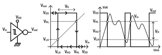 The Schmitt trigger (ST) has been used in both analog and digital domains to improve the noise immunity of circuits, thanks to its programmable or hard-wired hysteresis characteristics [,,,,,,]. This characteristic has been utilized in many CMOS circuit blocks including oscillators [,,,], input/output pads of integrated circuits [,], image sensors [,,,,,,], triangular carrier-based PWM modulators [], subthreshold SRAMs [,,,], CMOS transceivers [,,,,], impedance-to-frequency converters [], digital to analog converters (DACs) [], neuron-based analog to digital converters (ADCs) [,,], powerline communication systems [], binary logic circuits (i.e., adders [] and gates []), and sensors [,].