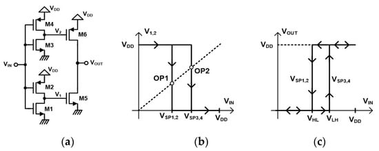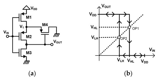 Figure 2a shows the N-type Dokic ST []. It is composed of four transistors and its hysteresis is shown in Figure 2b. Depending on how the input signal changes, two I/O characteristics can be observed. If the input goes from low (0) to high (VDD), the output changes from high to low at VHL. If the input goes from high (VDD) to low (0), the output changes from low (0) to high (VDD) at VLH. The VHL and VLH can be found when the input and output voltages are equal to each other at operating points OP1 and OP2, respectively, as marked in Figure 2b.