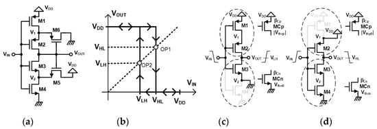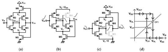 Figure 7 shows the low-power CMOS-type ST by Al-Sarawi []. It is composed of six transistors and its hysteresis is shown in Figure 7d. Depending on how the input signal changes, two I/O characteristics can be observed: If the input goes from low (0) to high (VDD) voltage level, the output state changes at VHL where the output goes from high (VDD) to low (0). If the input goes from high (VDD) to low (0), in this case, the output changes at VLH, where the output goes from low (0) to high (VDD). The VHL and VLH can be found when the input and the output voltages are equal at the operating points OP1 and OP2, as shown in Figure 7b,c. For the analysis, the switching voltage of the two inverters is assumed to be the same. Thus, the device sizes of M1 and M3, and M2 and M4 are the same.