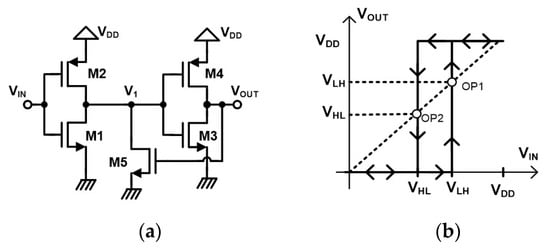 Figure 4 shows the CMOS type Dokic ST circuit []. It is composed of six transistors and its hysteresis is shown in Figure 4b. Depending on how the input signal changes, two I/O characteristics can be observed. If the input goes from low (0) to high (VDD) voltage level, the output state is changed at VHL where the output goes from high (VDD) to low (0) and vice versa, it switches from low (0) to high (VDD) at VLH. The VHL and VLH can be found when the input and output voltages are equal at operating points OP1 and OP2, as shown in Figure 4b.
