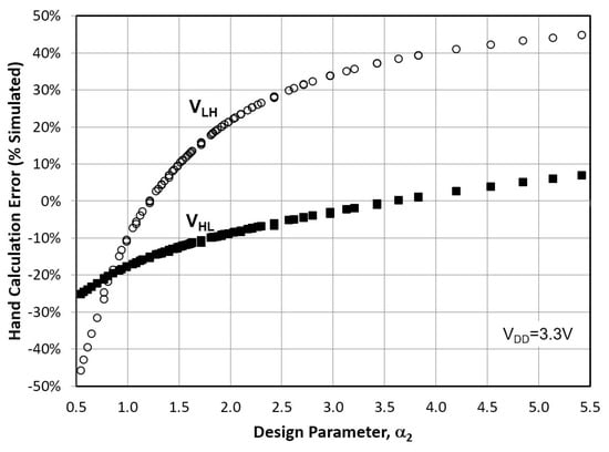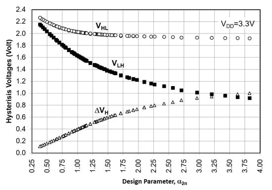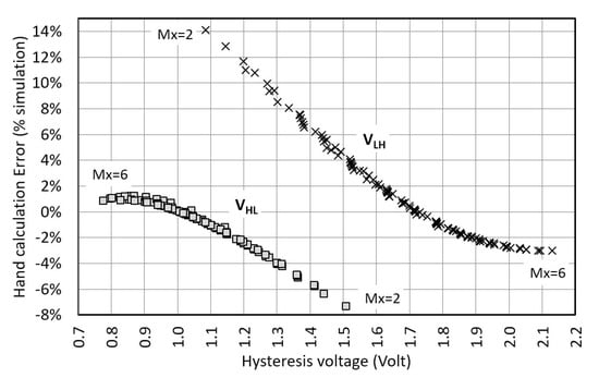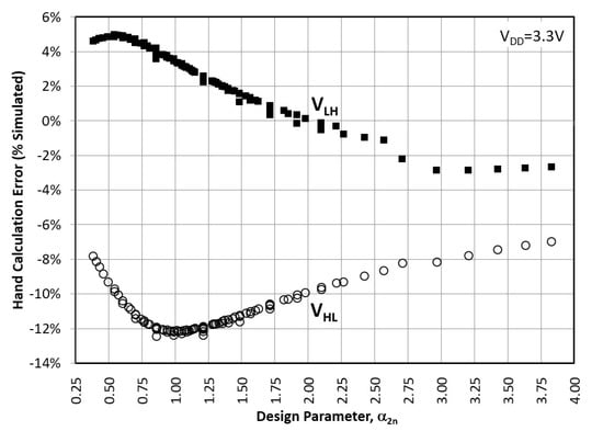 Figure 8 shows the simulation results for N-type Dokic ST. Hysteresis voltage (ΔVH) as large as 1 V could be achieved for α2n = 3.83. Moreover, smaller hysteresis voltages close to 0.1 V are also possible with N-type Dokic ST. Although they are not the same, Equations (15) and (17) result in the same VHL and VLH hand calculation values as the original Dokic equations (Equations (5) and (6) in []). Hand calculation accuracy compared to the simulation results are shown in Figure 9. Hand calculations result in lower than −13 and +5% errors for VHL and VLH, respectively. Wide hysteresis voltage can be achieved by choosing (W/L)1,2,4 = 20 (α1n = 1.0), and (W/L)3 = 2 (α2n = 3.83).