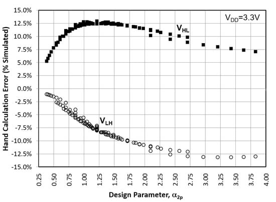 For P-type Dokic ST, the channel length of M3 is set to 4 Lmin and the bulk of M4 is connected to the node V1 while the dimensions of other transistors and bulk connections are kept the same as N-type Dokic ST. Figure 10 shows the simulation results of P-type Dokic ST for 3.3 V supply voltage. Hysteresis voltage (ΔVH) as large as 0.9 V could be achieved for α2p = 0.383. Moreover, hysteresis voltages close to 0.1 V are also possible with P-type Dokic ST for larger α2p values. The simulation results for the hysteresis voltages for different device sizes and supply voltages show that, typically, the VHL voltage is widely controlled by the design parameters. Figure 11 shows the hand calculation errors of the hysteresis voltages for the design parameter α2p using Equations (19) and (20) (or with Equations (8) and (12) in []). The error could be less than ±13%.