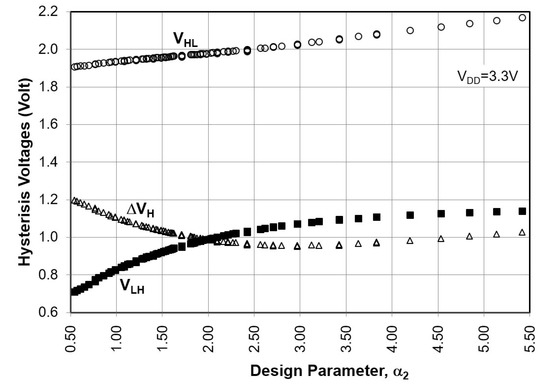 Simulated hysteresis voltages (VHL, VLH, ΔVH) of CMOS-type Dokic ST for different device sizes (0.54 < α2 < 5.4) at VDD = 3.3 V.