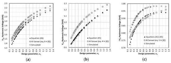 Comparison of design equations and simulated hysteresis voltages of Al-Sarawi’s ST for 3.3 V supply voltage (a) VHL vs. α1, (b) VLH vs. α1, and (c) ΔVH vs. α1.