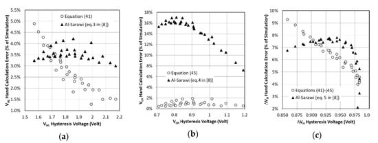 Figure 18 illustrates the hand calculation errors of proposed design equations in Section 2.4 as well as Al-Sarawi’s original design equations related to the simulated values of VHL, VLH, and ΔVH. It can be noticed from Figure 18b that VLH hand calculation error of the proposed design Equation (48) is less than 2% while it could be as large as 17% for Al-Sarawi’s original design equation. Additionally, hand calculation errors of VHL and ΔVH by the proposed design equations are always inversely proportional to VHL and ΔVH, respectively, and are lower than the calculation errors of Al-Sarawi’s original design equations.