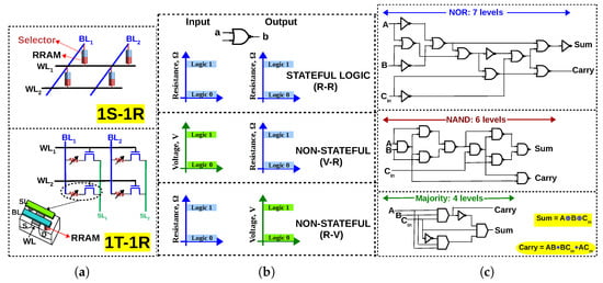 (a) 1S–1R and 1T–1R configuration of memristive memory array (b) If resistance is the only state variable, a memristive logic is said to be stateful. If voltage is also used in addition to resistance, it is said to be non-stateful (c) 1-bit full adder in terms of NOR gates [31], NAND gates [32,33] and majority gates [34]; Majority logic achieves less logical depth than NAND/NOR for 1-bit full adder.