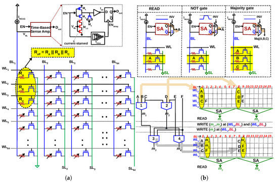 (a) In-memory majority gate proposed in [45,46]: When three rows are activated () simultaneously in a 1T-1R array, the three resistances will be in parallel (Inputs of the majority gate are represented as resistances ). An ‘in-memory’ majority gate can be implemented by accurately sensing the effective resistance during READ. (b) NOT operation implemented with a 2:1 multiplexer at the output of the SA. With majority and NOT gate implemented as READ, multiple levels of logic can be executed by writing the data back to the array, simplifying computing to READ and WRITE operations in memory. Multiple majority gates can be executed in parallel in the memory array, thereby reducing latency of in-memory computation.