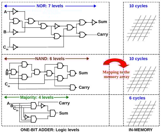 n levels of Boolean logic will require cycles in-memory, where x depends on the memristive logic family. It must be noted that the number of cycles required (10 cycles for NOR, NAND and 6 cycles for MAJORITY) is already optimized by executing multiple gates in parallel (see the mapping for NOR [31], NAND [49] and MAJORITY [45]).