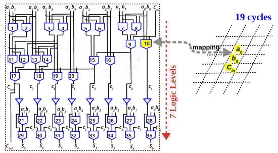 Will the reduced latency obtained by majority logic for 1-bit full adder translate to n-bit adders? In this section, eight-bit adders using different logic primitives are analysed and compared to answer this question. From Figure 5, it is evident that to minimize in-memory latency, the number of logic levels which is mapped to the memory array must be minimized. Parallel-prefix (PP) adders are a family of adders originally proposed to overcome the latency incurred by the rippling of carry in ripple carry adders. Such adders have the capability to minimize the latency to O(log n), for n-bit adders. PP adders are conventionally expressed as “propagate” () and “generate” terms (). Hence, they are implemented as AND, OR and XOR gates. As already stated, a memristive logic family cannot implement such a heterogeneity of gates. As illustrated in Figure 6, the XOR gate has to be implemented as NAND gates [37,49], increasing the logic levels to 12. Such an eight-bit PP adder (Sklansky) is expressed in OR/AND logic primitive and implemented in the memory array in 37 cycles [57]. Using majority logic, an 8-bit PP adder is implemented in memory in [46]. Since majority gate is the basic building block for many emerging nanotechnologies, prior works [13,14] have formulated such PP adders in majority logic. The majority-based eight-bit adder depicted in Figure 7 is derived from [13,14]. For an eight-bit adder, the logical depth is six levels of majority gates and one level of NOT gates, and at most eight gates are needed simultaneously in each level. Since multiple majority gates can be executed in parallel (Figure 4), they can be mapped to the array in 19 cycles, as elaborated in [46].