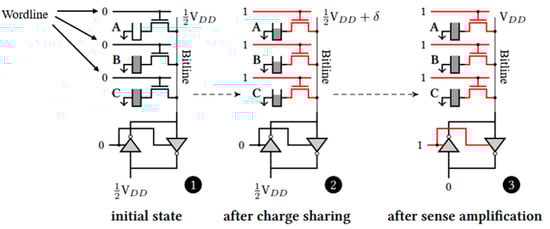 An example of an OR operation being performed on DRAM cells A and B using charge-sharing in triple-row activation [].