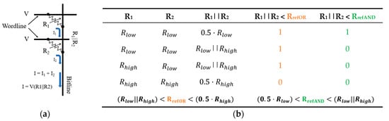 Example of AND and OR operations in memory that use resistance-based memory cells. (a) Activating two resistors R1 and R2 on the same bitline in a memristive crossbar array (MCA) results in an effective resistance of R1||R2 on the bitline (figure adapted from []). This effective resistance can be compared against preset reference resistance values (RrefOR, RrefAND) to ascertain the result of the Boolean operation; (b) shows the truth table [].