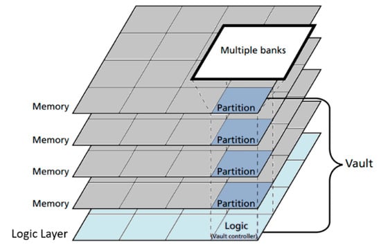 The type of memory to use is an important decision for DCC system designers working with NMP systems. Different memory technologies have unique advantages that can be leveraged for particular operations. For example, write-heavy operations are more suited to DRAM than resistive memories due to the larger write latency of resistive memories. This fact and DRAM’s widespread adoption has led to the creation of a commercial DRAM NMP solution UPMEM []. UPMEM replaces standard DIMMs, allowing it to be easily adopted in datacenters. A 3D-stacked DRAM architecture like the HMC [] can accelerate atomic operations of the form read-modify-write (RMW) due to the memory level parallelism supported by the multi-vault, multi-layer structure shown in Figure 4. In fact, NMP designs prefer 3D-DRAM over 2D-DRAM due to several reasons. Firstly, 3D-DRAM solutions such as HMC 2.0 [] have native support for executing simple atomic instructions. Secondly, 3D-DRAM allows for easy integration of a logic die that provides greater area for placing more complex PEs near memory than 2D counterparts. Thirdly, PEs are connected using high bandwidth through-silicon vias (TSVs) to memory arrays as opposed to off-chip links, providing much higher memory bandwidth to the PE. Fourthly, the partitioning of memory arrays into vaults enables superior memory-level parallelism.