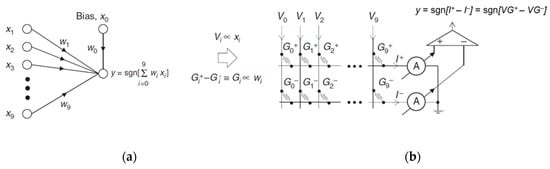 Resistive memory in its memristive crossbar array (MCA) configuration can significantly accelerate matrix multiply operations commonly found in neural network, graph, and image processing workloads [,,,,,,,,]. Figure 5a shows a mathematical abstraction of one such operation for a single-layer perceptron implementing binary classification, where are the inputs to the perceptron, are the weights to the perceptron, sgn is the signum function, and is the output of the perceptron []. The MCA is formed by non-volatile resistive memory cells placed at each crosspoint of a crossbar array. Figure 5b shows how the perceptron can be mapped onto an MCA. The synaptic weights of the perceptron, , are represented by physical cell conductance values, G. Specifically, each weight value is represented by a pair of cell conductances, i.e., to represent both positive and negative weight values. The inputs, x, are represented by proportional input voltage values, V, applied to the crossbar columns. For the device shown, V = ±0.2 V. In this configuration, the weighted sum of the inputs and synaptic weights () can be obtained by reading the current at the each of the two crossbar rows ( and ). Finally, the sign of the difference in the current flowing through the two rows () can be determined, which is equivalent to the original output . In this manner, MCA is able to perform the matrix multiplication operation in just one step.