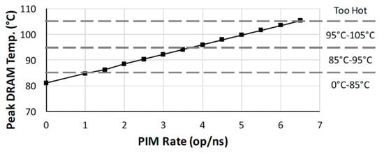 Although it would be tempting to offload all instructions to the PIM or NMP system and eliminate most data movements to/from the host processor, there are significant barriers to doing so. Firstly, memory chips are usually resource constrained and cannot be used to perform unrestricted computations without running into power/thermal issues. For example, 3D-DRAM NMP systems often place memory processors in the 3D memory stack that can present significant thermal problems if not properly managed. Figure 6 [] demonstrates how the peak temperature of a 3D-stacked DRAM with a low-power GPU on the logic layer changes with the frequency of offloaded operations (PIM rate). Consistent operation at 2 op/ns will result in the DRAM module generating a thermal warning at 85 °C. Depending on the DRAM module, this can lead to a complete shutdown or degraded performance under high refresh rates. If the PIM rate is unmanaged, the DRAM cannot guarantee reliable operation due to the high amount of charge leakage under high temperature.