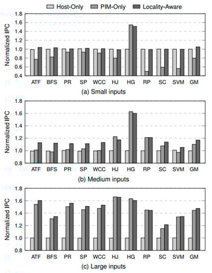 Secondly, memory processors are not guaranteed to improve power and performance for all workloads. For example, workloads that exhibit spatial or temporal locality in their memory accesses are known to perform worse in PIM/NMP systems [,]. When executed on a host processor, these workloads can avoid excessive DRAM accesses and utilize the faster, more energy efficient on-chip cache. Only the least cache-friendly portions of an application should be offloaded to the memory processors while the cache-friendly portions are run on the host processor. Figure 7 [] compares the speedup achieved for a “Host-Only” (entire execution on the host), “PIM-Only” (entire execution on the memory processor), and “Locality-Aware” (offloads low locality instructions) offloading approach to an NMP system for different input sizes. It should be noted that in [], PIM refers to an HMC-based architecture that we classify as NMP. For small input sizes, all except one application suffers from severe degradation with “PIM-Only”. This is because the working set is small enough to fit in the host processor’s cache, thus achieving higher performance than memory-side execution. As input sizes grow from small to medium to large, the performance benefit of offloading is realized. Overall, the locality aware management policy proves to be the best of the three approaches and demonstrates the importance of correctly deciding which instructions to offload based on locality. Another useful metric to consider when making offloading decisions is the expected memory bandwidth-saving from the offloading [,,].