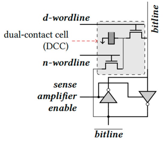 Ambit’s implementation of the NOT operation by adding a dual-contact DRAM cell to the sense amplifier. The grey shaded region highlights the dual-contact cell [].